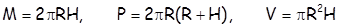 (М - површина омотача, P - површина ваљка, V - запремина, R – полупречник основе,   Н - висина).