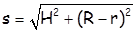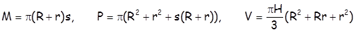 (М - површина омотача, P - површина купе, V - запремина, R – полупречник основе,   Н - висина, - изводница).