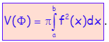 Нека је у равнидат криволинијски трапезограничен непрекидном и позитивном функцијоми нека телонастаје обртањем фигуреоко осе. Тада је запремина тела: