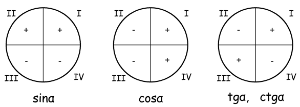 Знаци тригонометријских функција у зависности од квадранта у којем се аргумелт налази приказани су на горњим сликама.